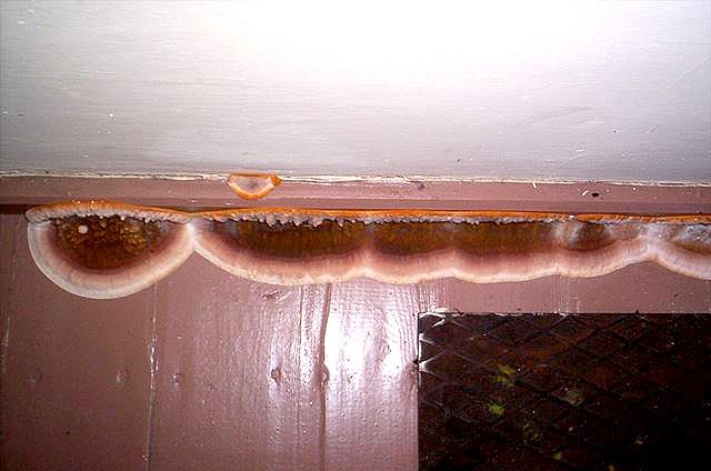 U góry widzimy owocniki grzyba domowego właściwego potocznie zwanego Stroczkiem łazwym czyli Serpula lacrymans.